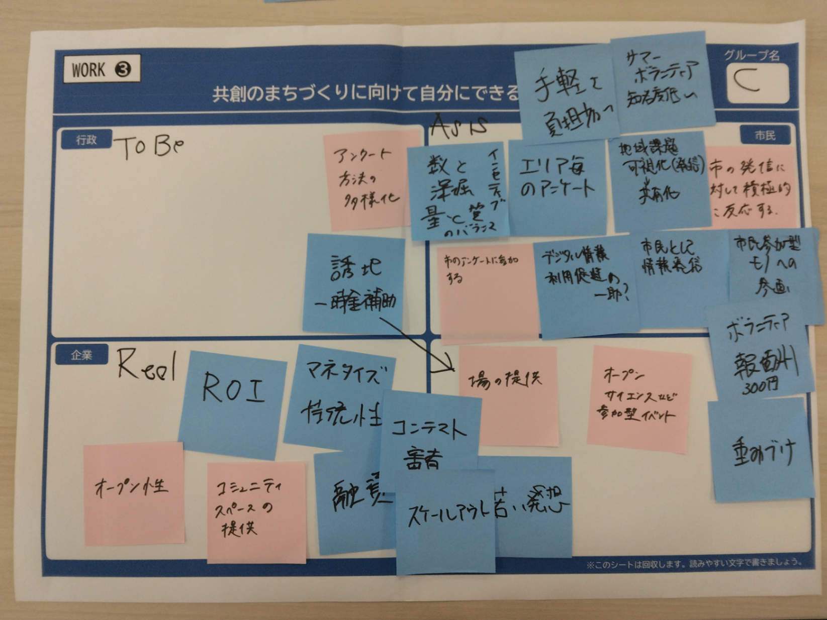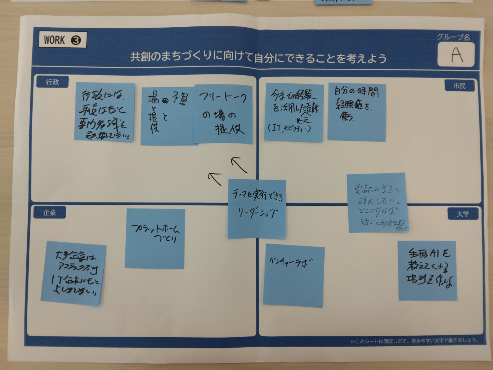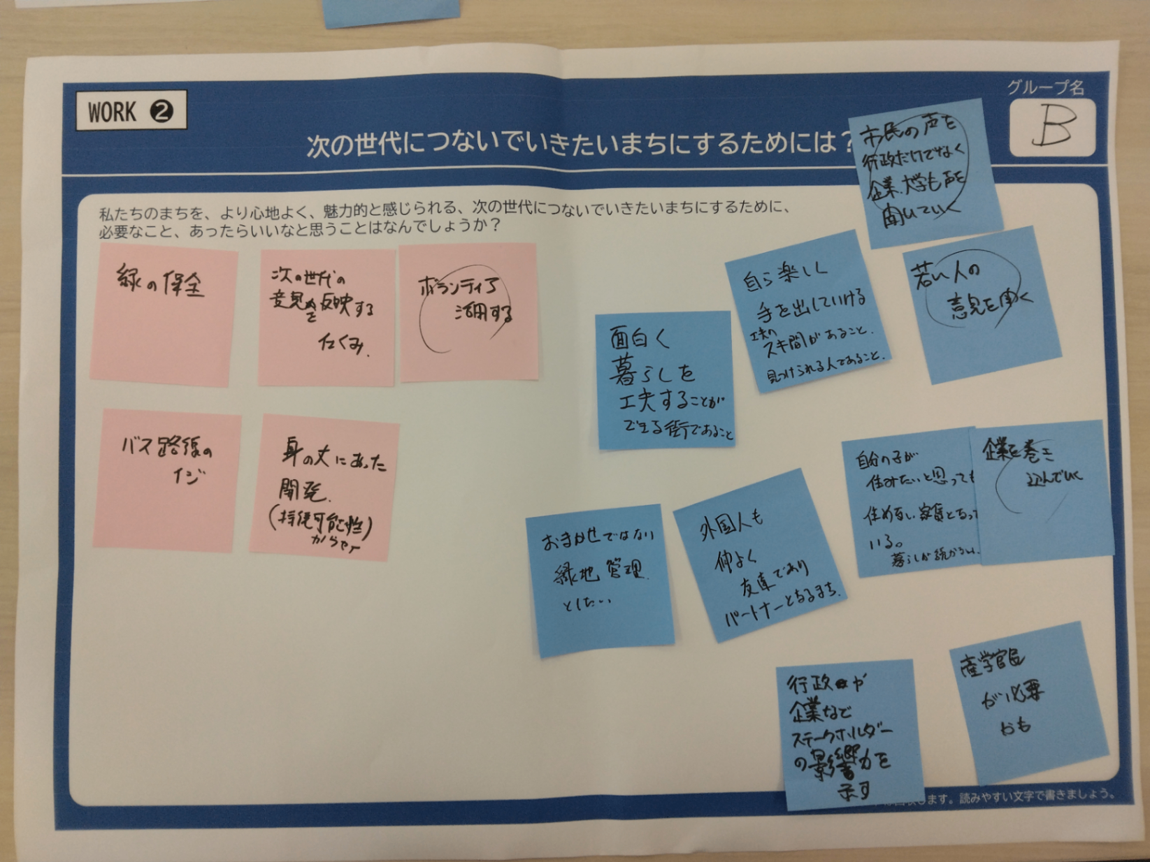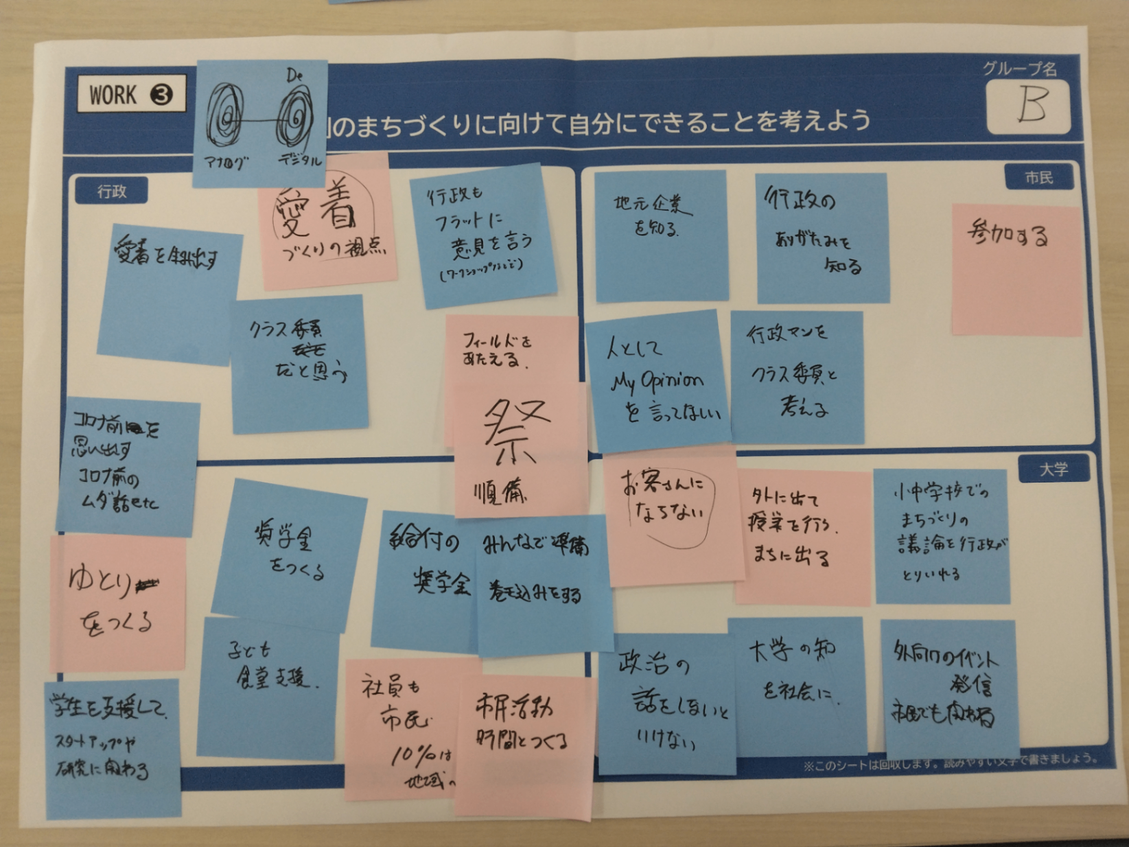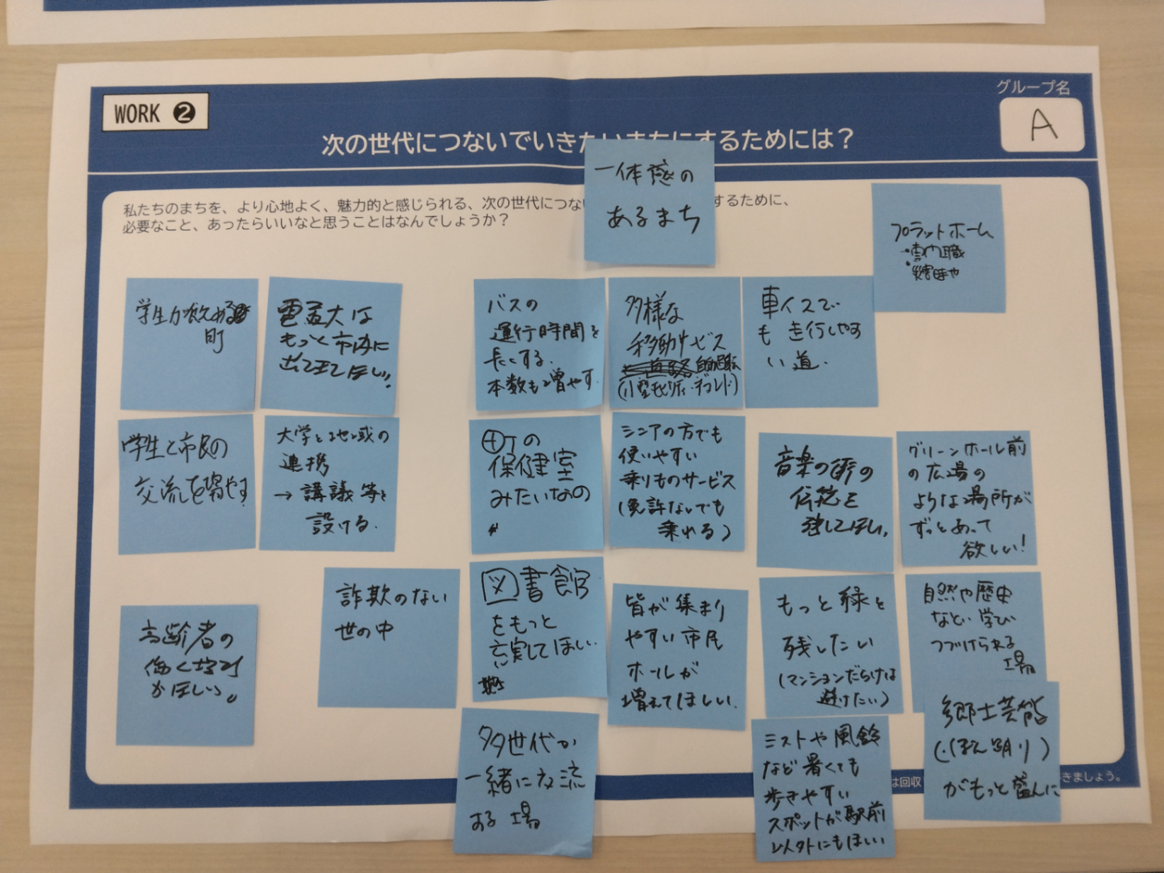 普段あまり考える機会のないテーマに、はじめは悩まれている姿もありましたが、まずは自分たち市民に何ができるだろう…それを他のプレーヤーにはどう後押ししてもらえるだろう…と様々なプレーヤーが協力してまちづくりを進めていくことについて、各グループ内で活発な意見交換がされていました。