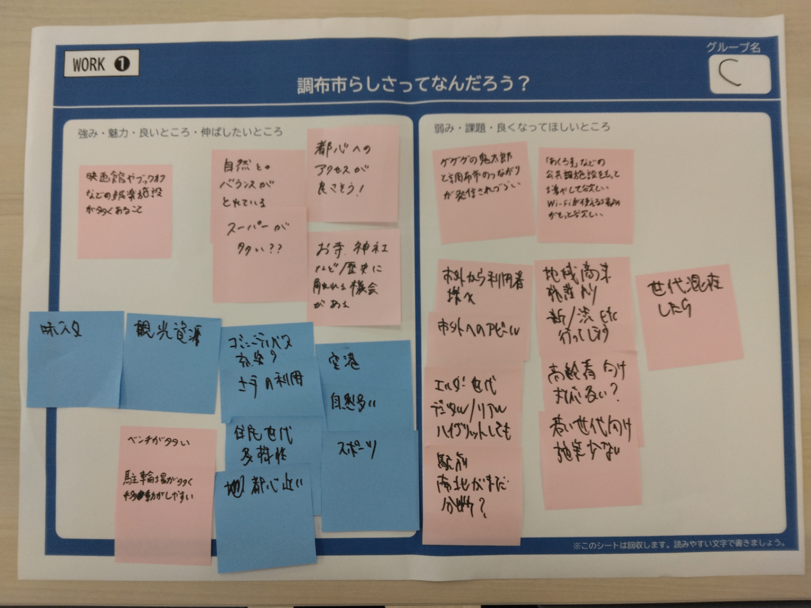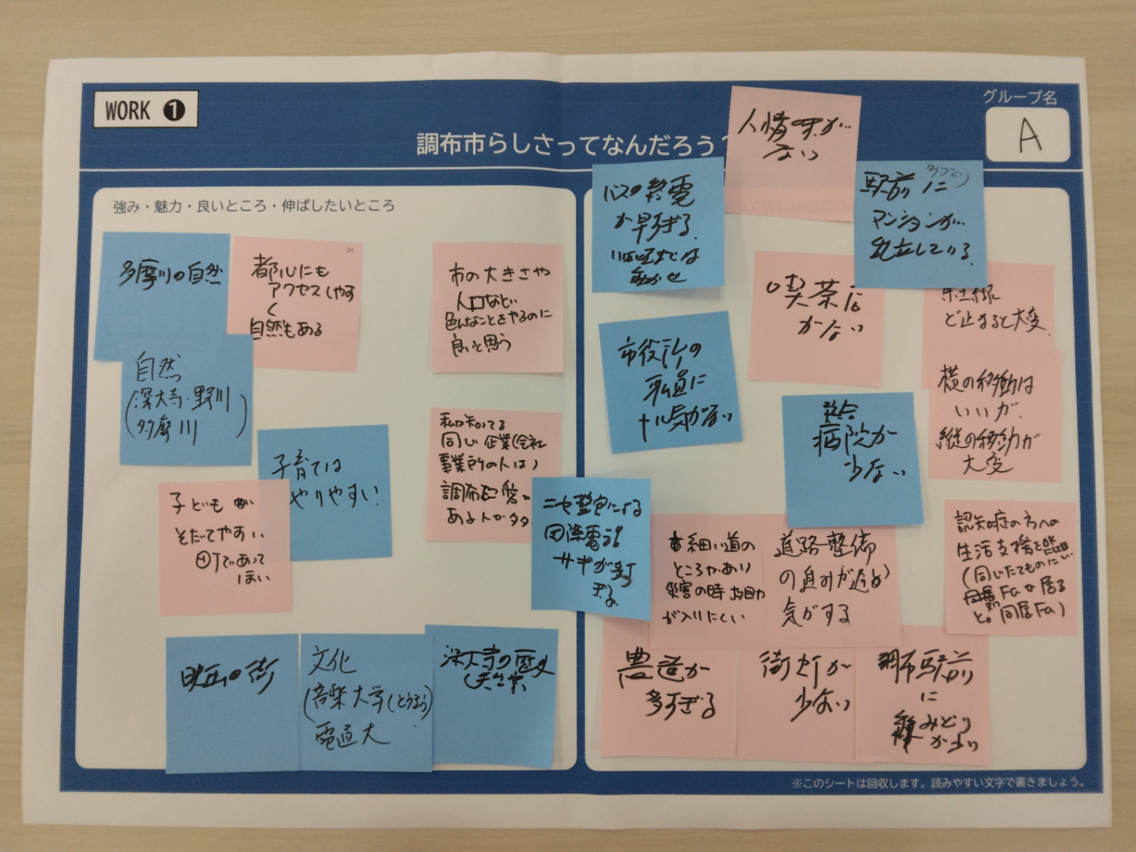 まず、みんなが思う「“いま”の調布のまち」を共有するために、「強みや良いところ」「もっと良くなってほしいところ」を付箋に書き出しました。