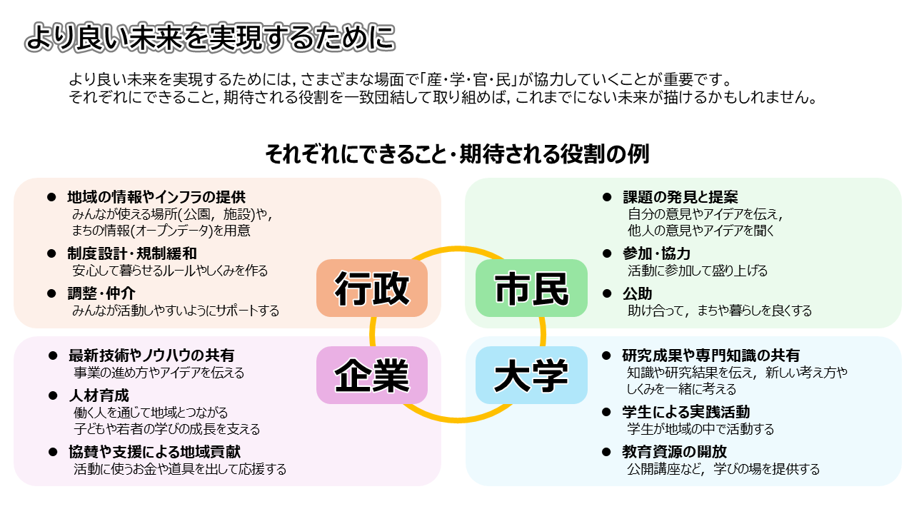 それを実現するために、企業・大学・行政・市民には、何ができると思いますか?