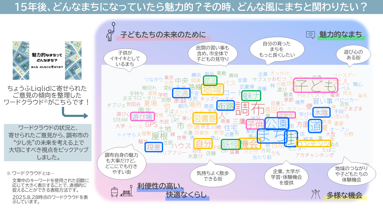 みなさんの意見から、調布市の“少し先”の未来を考える上で大切にするべき視点が見えてきました。
