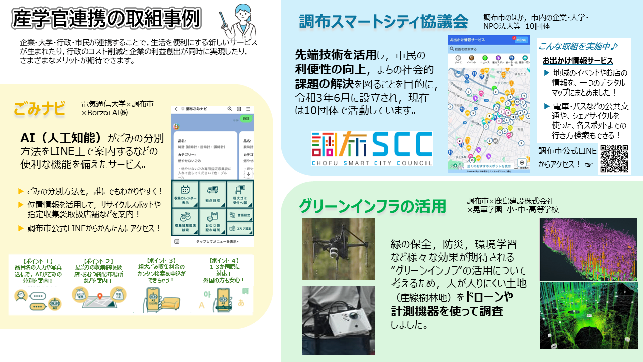 みなさんの描く未来の調布市を実現するために、そして今ある調布市の強みや魅力をさらに伸ばすために、企業が持つ最新技術、大学が持つ専門知識、行政が持つ地域の情報や仕組みを組み合わせれば、これまでにない解決策が生まれるかもしれません。